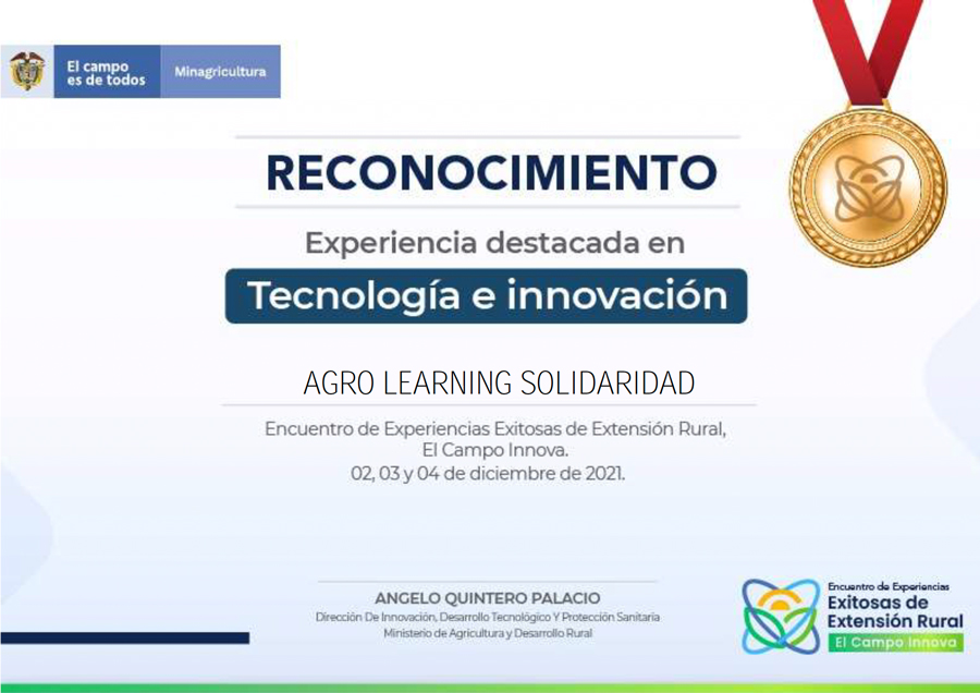 El pasado 3 de diciembre la plataforma educativa de Solidaridad Agrolearning recibió el reconocimiento como experiencia destacada en tecnología en innovación en el evento Encuentro de Experiencias Exitosas de Extensión Rural en América Latina y el Caribe. El campo Innova, organizado por la oficina de innovación del Ministerio de Agricultura y Desarrollo Rural de Colombia, el Consejo Superior del SNIA y el Instituto Interamericano de Cooperación para la Agricultura, reunió la participación de más de 120 experiencias de latinoamérica relacionadas con prácticas que benefician el desempeño de los productores, mejoren su competitividad y sostenibilidad, así como su aporte a la seguridad alimentaria.