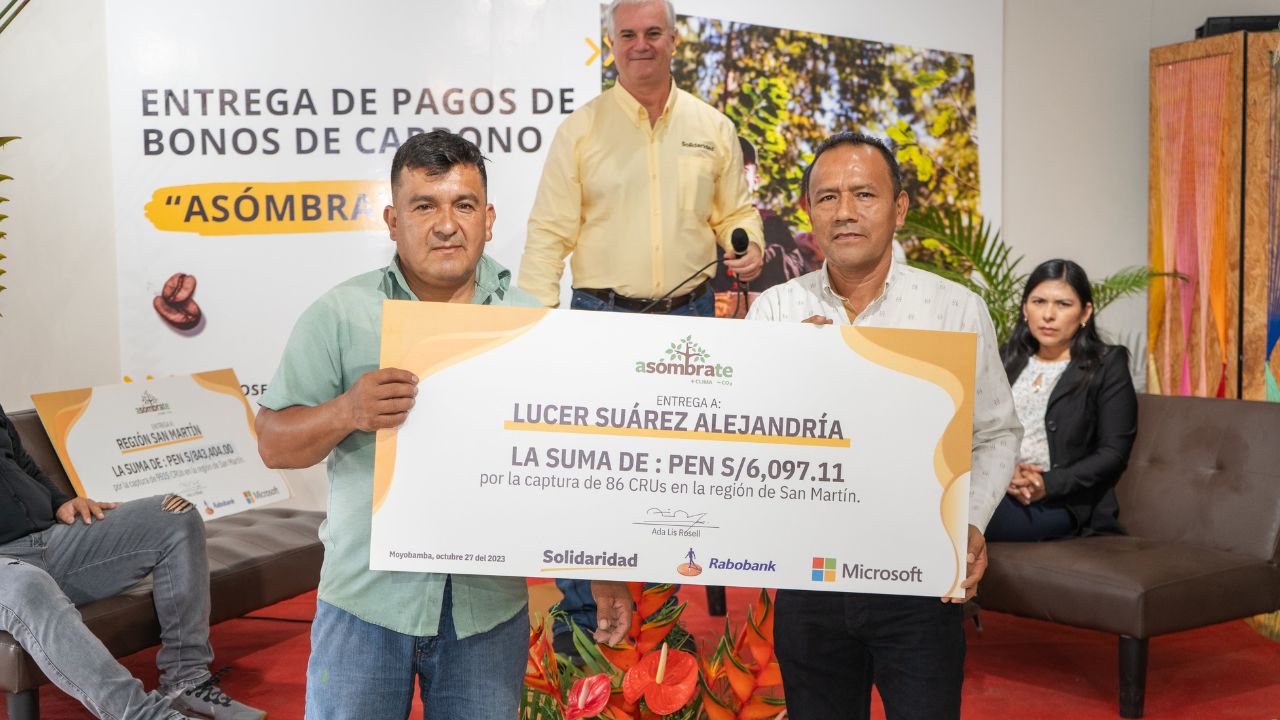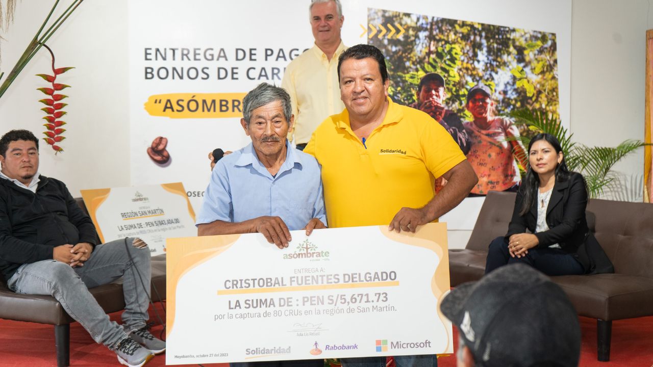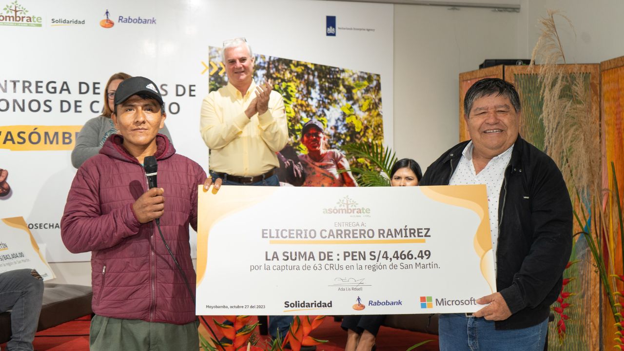 En una ceremonia de reconocimiento, Solidaridad y Rabobank, en presencia del Gobierno Regional de San Martín y otros actores de la cadena de valor de café y cacao dentro de la región, entregaron pagos a 20 pequeños productores de café que obtuvieron la mayor cantidad de capturas de CO2. El pago promedio de estos caficultores fue de S/5,441.54 (USD 1440), y los beneficiarios más reconocidos fueron pagados hasta con S/9,243.96 (USD 2444.59). Estos 20 caficultores son los primeros retribuidos de un total 376 productores.
