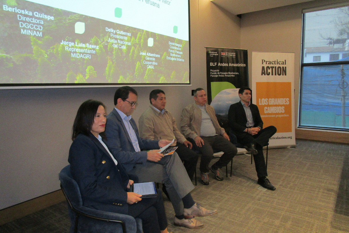El evento incluyó un panel de expertos integrado por Berioska Quispe, directora de la Dirección General de Cambio Climático y Desertificación (DGCCD) del MINAM; Jorge Luis Saenz, representante del MIDAGRI; Delky Gutiérrez, presidente de la Junta Nacional del Café; José Altamirano, gerente de la cooperativa CASIL; y David Alegría, coordinador del Fondo de Paisajes Biodiversos de la Embajada Británica en Perú. Los aportes de los panelistas permitieron visibilizar los principales desafíos del sector, así como destacar el rol estratégico que tiene el escalamiento de incentivos climáticos en la transición hacia una cadena de producción más sostenible, inclusiva y libre de deforestación.